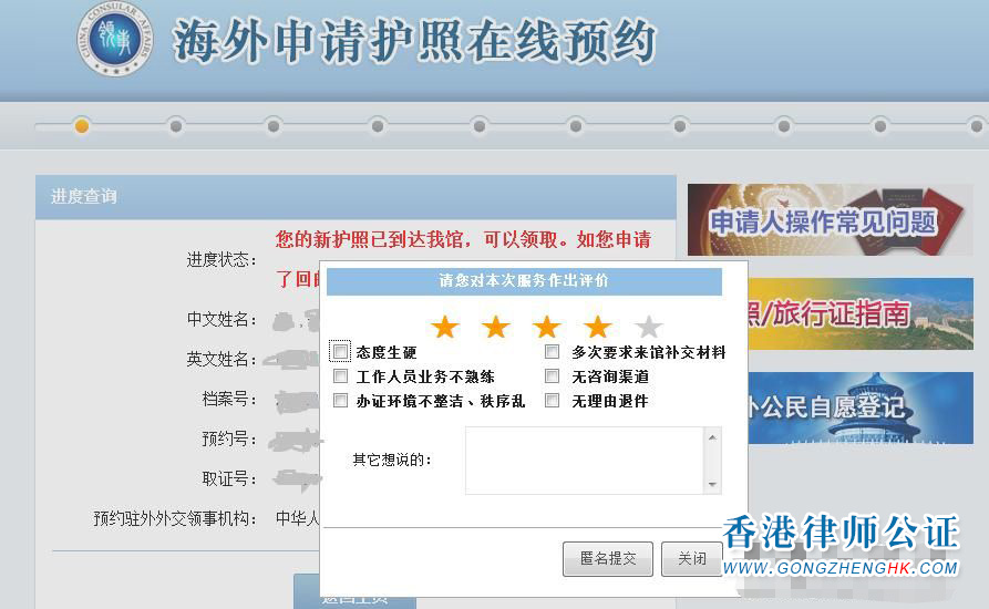 預(yù)約系統(tǒng)還增加了“收集領(lǐng)事服務(wù)評價”功能,當(dāng)預(yù)約系統(tǒng)進(jìn)度顯示“您的新護(hù)照已到達(dá)我館,可以領(lǐng)取”狀態(tài)時,申請人即可對駐外使領(lǐng)館窗口服務(wù)、業(yè)務(wù)辦理、辦證環(huán)境等進(jìn)行在線評價。外交部領(lǐng)事司將定期收集大家對駐外使領(lǐng)館的服務(wù)評價,更有針對性地改進(jìn)駐外使領(lǐng)館領(lǐng)事窗口服務(wù)工作。
