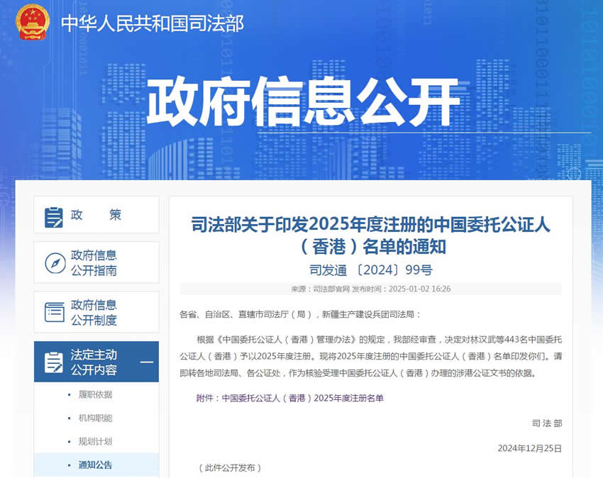 根據(jù)《中國委托公證人(香港)管理辦法》的規(guī)定,我部經(jīng)審查,決定對林漢武等443名中國委托公證人(香港)予以2025年度注冊?,F(xiàn)將2025年度注冊的中國委托公證人(香港)名單印發(fā)你們。請即轉(zhuǎn)各地司法局、各公證處,作為核驗受理中國委托公證人(香港)辦理的涉港公證文書的依據(jù)。